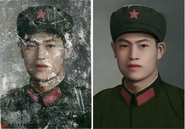 高级修复: 原图保存不好的话破损面积较大,并且模糊程度严重,这样的照片只能参考原图信息。 作全面的翻新的时候当然原图清晰的也可以做高级修复。因为看的更准确,则做出来的效果也越好。高级修复是目前老照片修复中难度比较大的一种技术,需要利用移植和合成等多种技术结合,还得有绘画欣赏修复能力和扎实的PS基本功才能完成。因为工絮太过复杂,要用到大量的素材,所以高级修复只针对单人半身的老照片,全身的涉及时间素材和客人承受能力的问题,因此一般都不做高级修复。